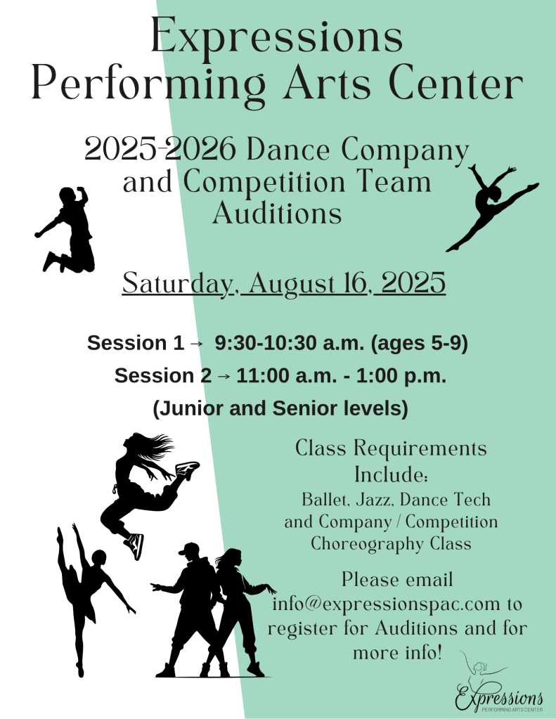 ** Expressions Competition and Company Auditions slated for August 16, 2025 — Want to check out our Competition Program and be a part of the Expressions Award-winning Competition Team? Contact us TODAY to hold your spot for our Spring 2025- 2026 Season Auditions!! **