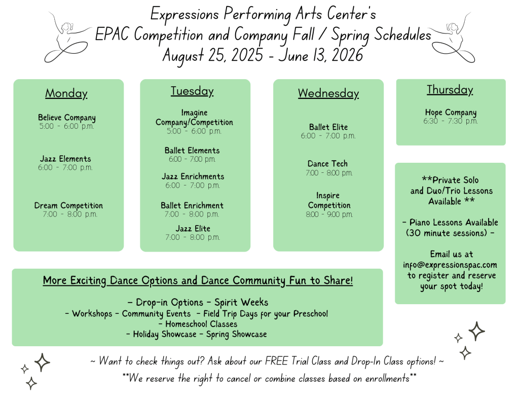 ~*~ Our 2025 – 2026 Fall/Spring Season Schedule of classes at Expressions is HERE!!!! Check out what classes we will be offering this Fall! — Don’t see something you would like to have offered? We LOVE suggestions and requests! Email us today with your dance, acro and dance fit needs and we’ll be happy to help!