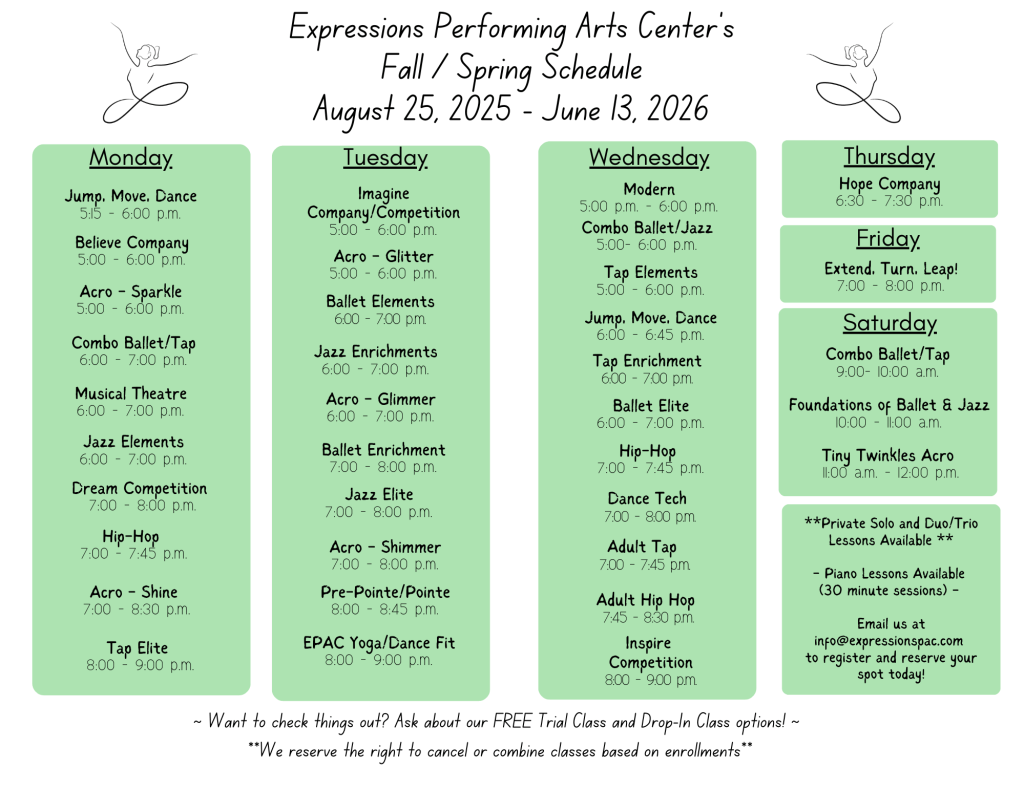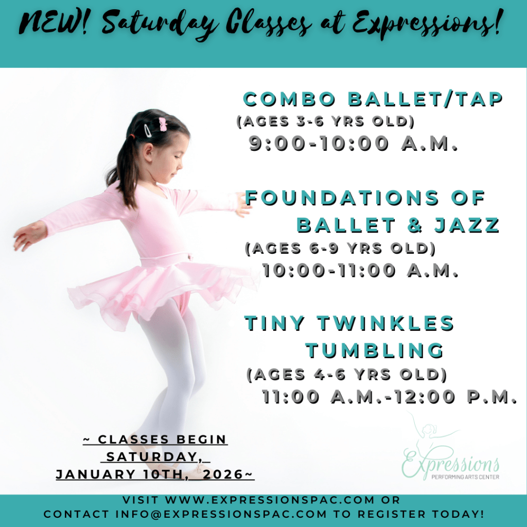 ~*~ Our 2025 – 2026 Fall/Spring Season Schedule of classes at Expressions is HERE!!!! Check out what classes we will be offering this Spring! — Don’t see something you would like to have offered? We LOVE suggestions and requests! Email us today with your dance, acro and dance fit needs and we’ll be happy to help!
