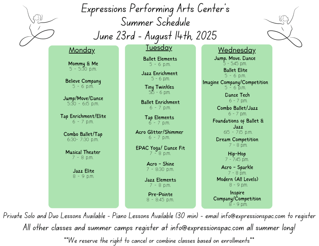 Summer is a GREAT time to try something NEW, master current skills and learn new ones, or pick up your dance shoes again! Want to learn how to play the piano? We have private lesson options for that too!